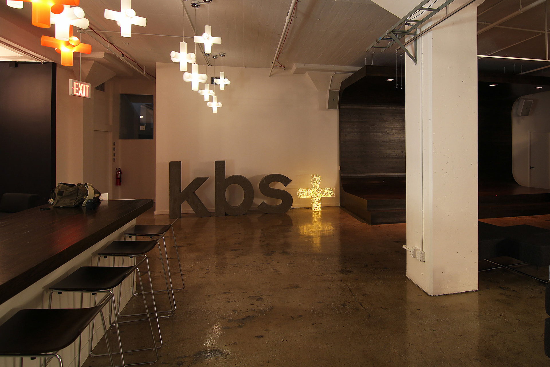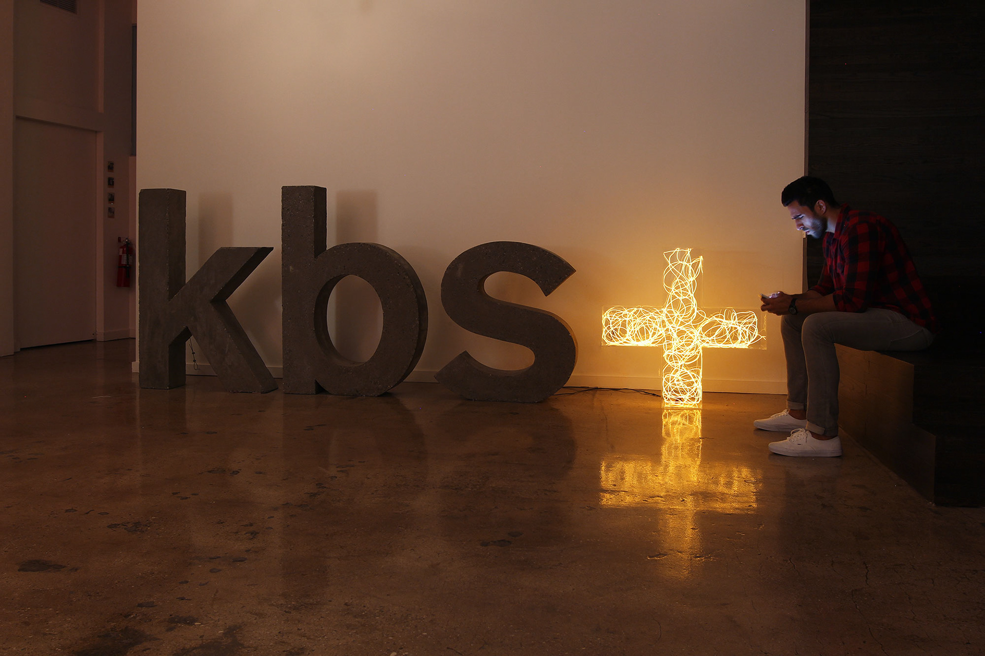 A one-ton version of the kbs+ logo, made of cast concrete and delicately illuminated acrylic